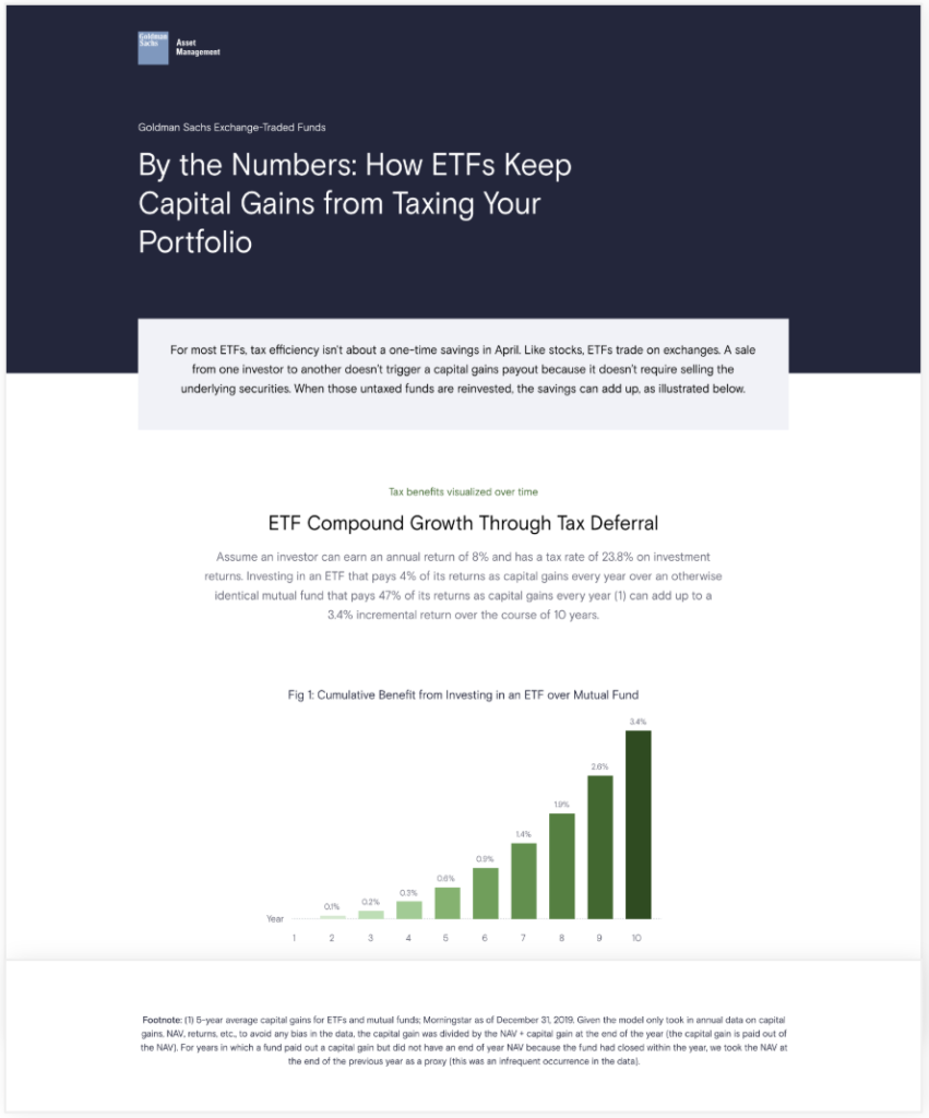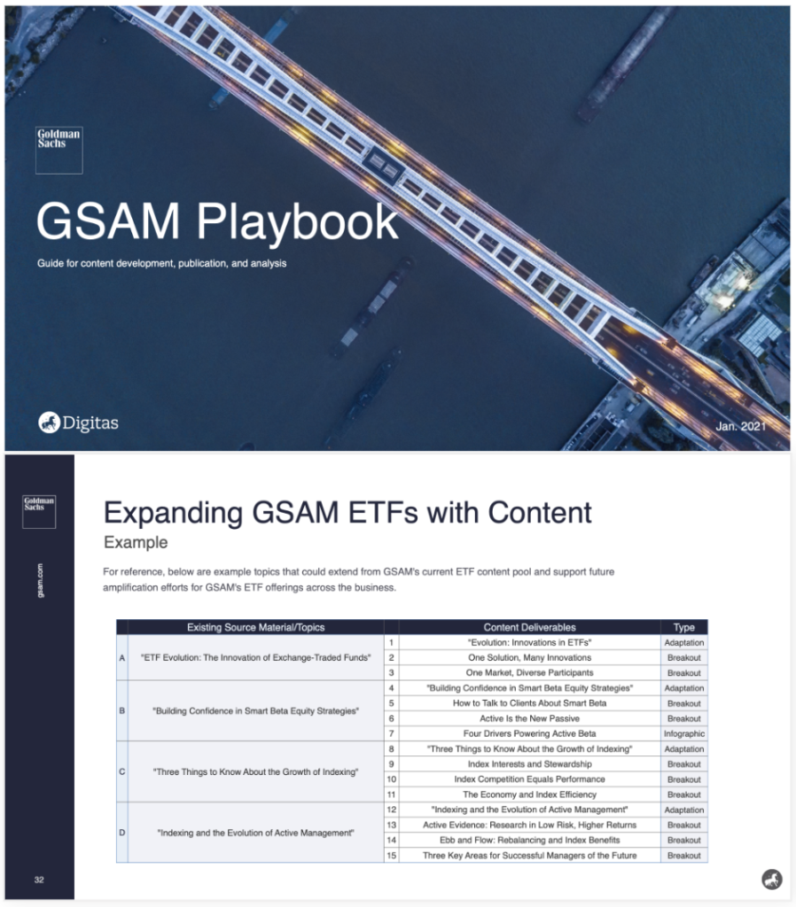 As part of the content playbook creation, I wrote and partnered with our design team to craft living content pieces in reaction to developing market news in accordance to business growth objectives (in the case featured here, expanding awareness of Goldman Sachs ETF offerings), as well as regulations and legal.