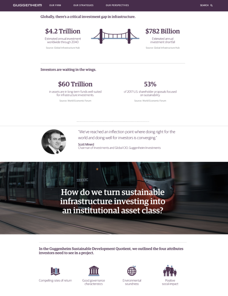 For Guggenheim Partners’ presence at the World Economic Forum in Davos, I led the development of a landing page and onsite graphics, shaping messaging that aligned with their brand and audience. Collaborating across content, design, and regulatory considerations, I helped craft data visualizations, motion graphics, and storytelling elements that brought their financial and investment insights to life in a high-profile setting.